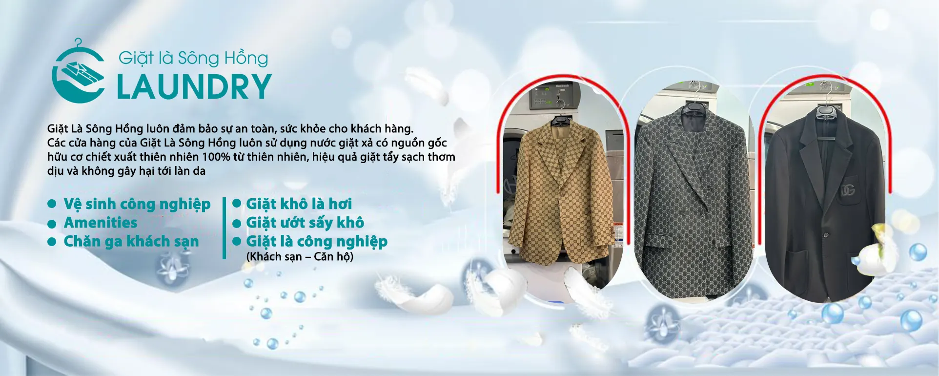 Giặt Là Sông Hồng luôn đảm bảo sự an toàn, sức khỏe cho khách hàng. Các cửa hàng của Giặt Là Sông Hồng luôn sử dụng nước giặt xả có nguồn gốc hữu cơ chiết xuất thiên nhiên 100% từ thiên nhiên, hiệu quả giặt tẩy sạch thơm dịu và không gây hại tới làn da